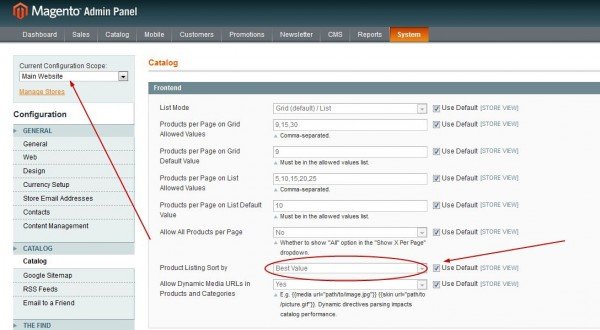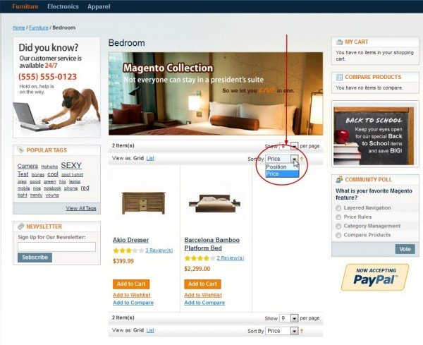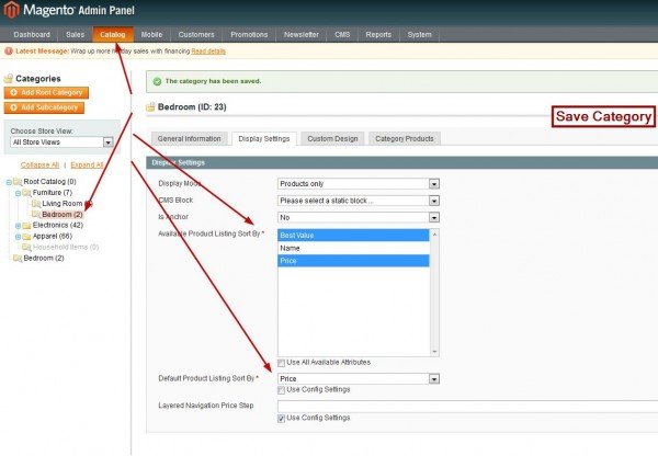 Let’s modify “Default Product Listing Sort By”. If you deselect “Use Config Settings” and if you select “Price” for “Default Product Listing Sort By”, on frontend for specified category you’ll see that all items are now sorted by price ascending (growing upward). If you have Magento CE 1.7 with Sample Data you can modify sorting by Price for, i.e. Bedroom category. Additionally you can deselect “Use All Available Attributes” for “Available Product Listing Sort By” and if you check only few of them (“Best Value” and “Price”), on frontend you’ll be able to sort only by selected options. Now click “Save Category” button.